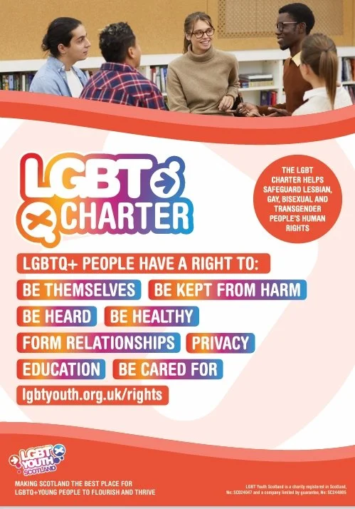 The LGBT Charter is a programme that enables our organisation to proactively improve LGBTQ+ inclusion for staff and service users, through meeting objectives and standards set out by LGBT Youth Scotland. Our goal in undertaking this programme is to ensure all LGBTQ+ staff and centre users feel safe, supported and included.